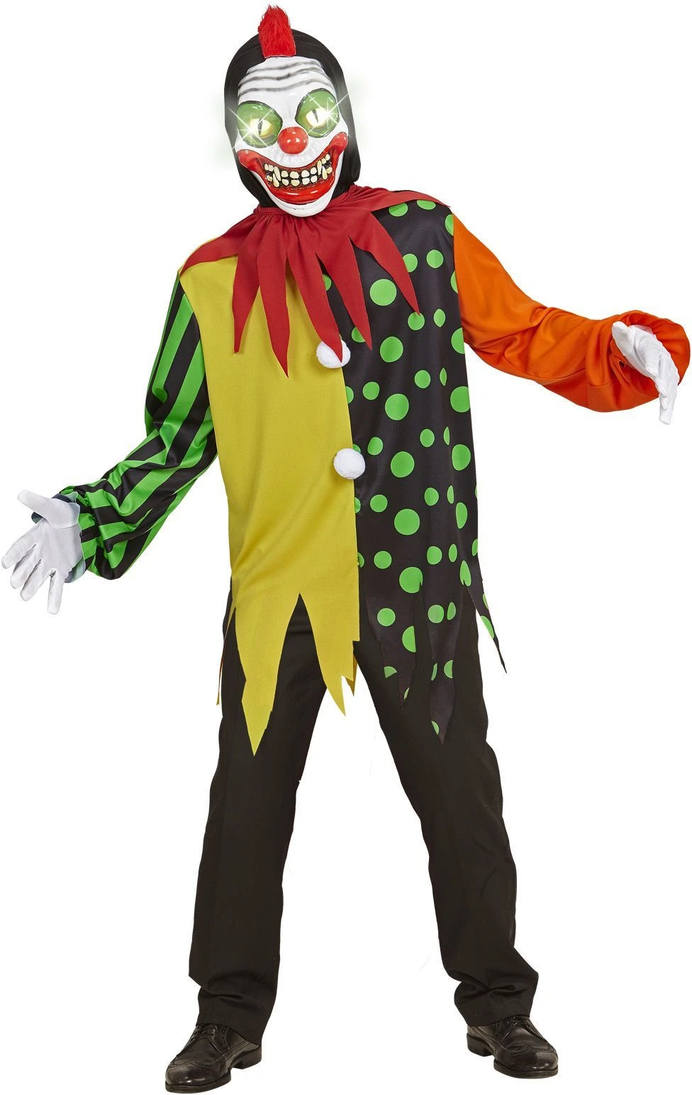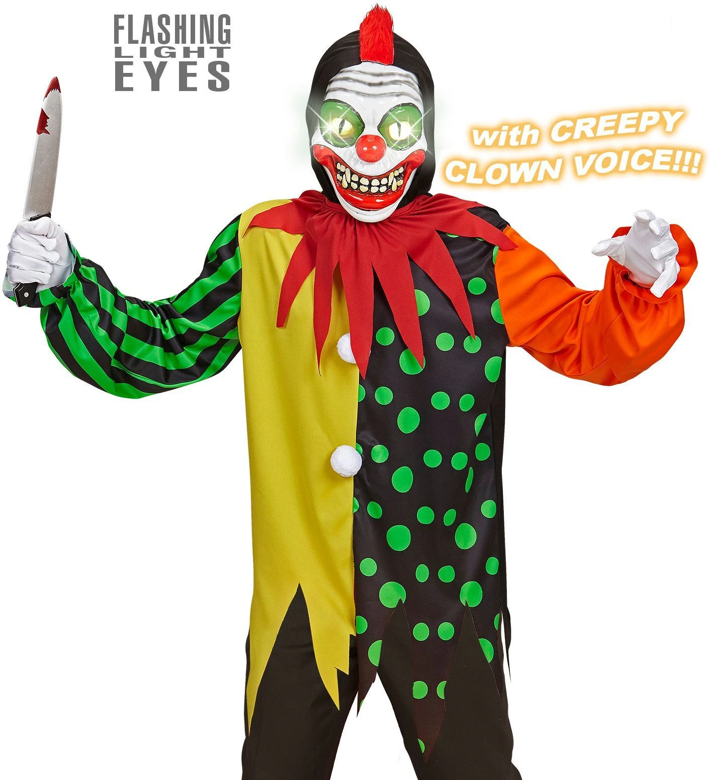- Pakketinhoud: Jas met capuchon, kraag, masker met lichtgevende ogen en 3 kwade clown stemgeluiden